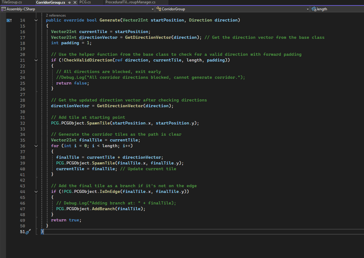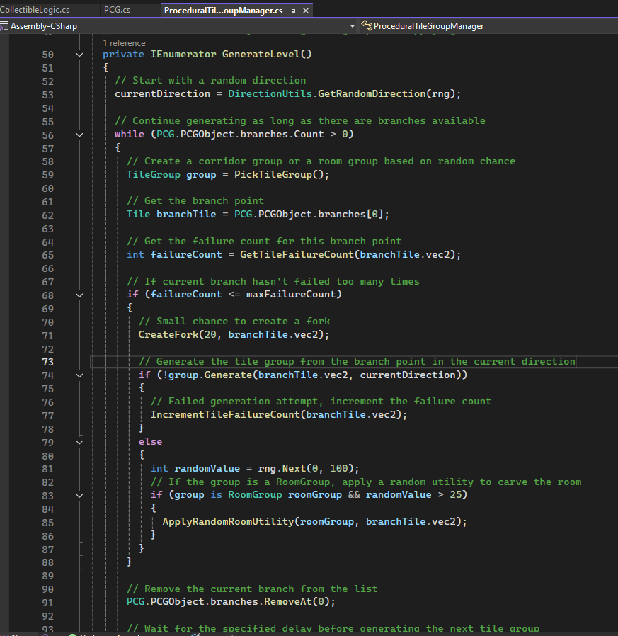 Random corridors generate in lines of various sizes, creating a more consistent look. Occasionally, corridors create forks to additional corridors, and eventually create rooms (code snippit of random corridor generation)