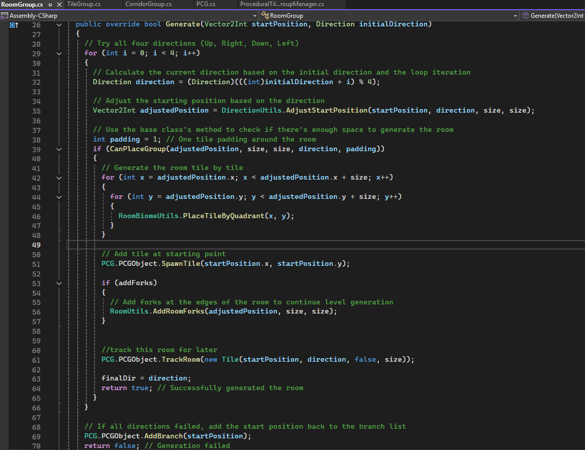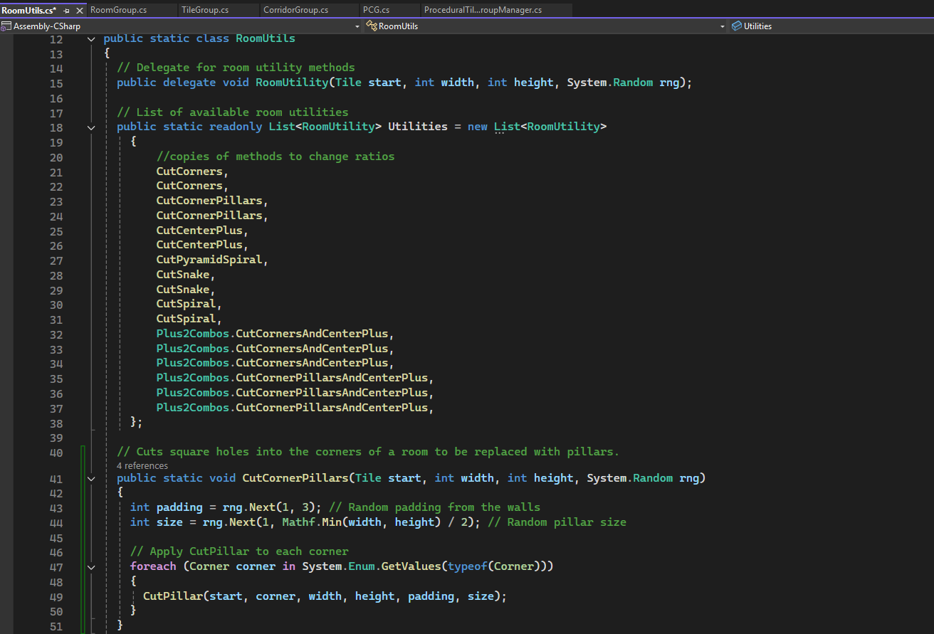 For simplicity, room and corridor variations take existing rooms and remove tiles in specific patterns, sometimes combined with other variations to create combinations for more variation (code snippit of room variations)