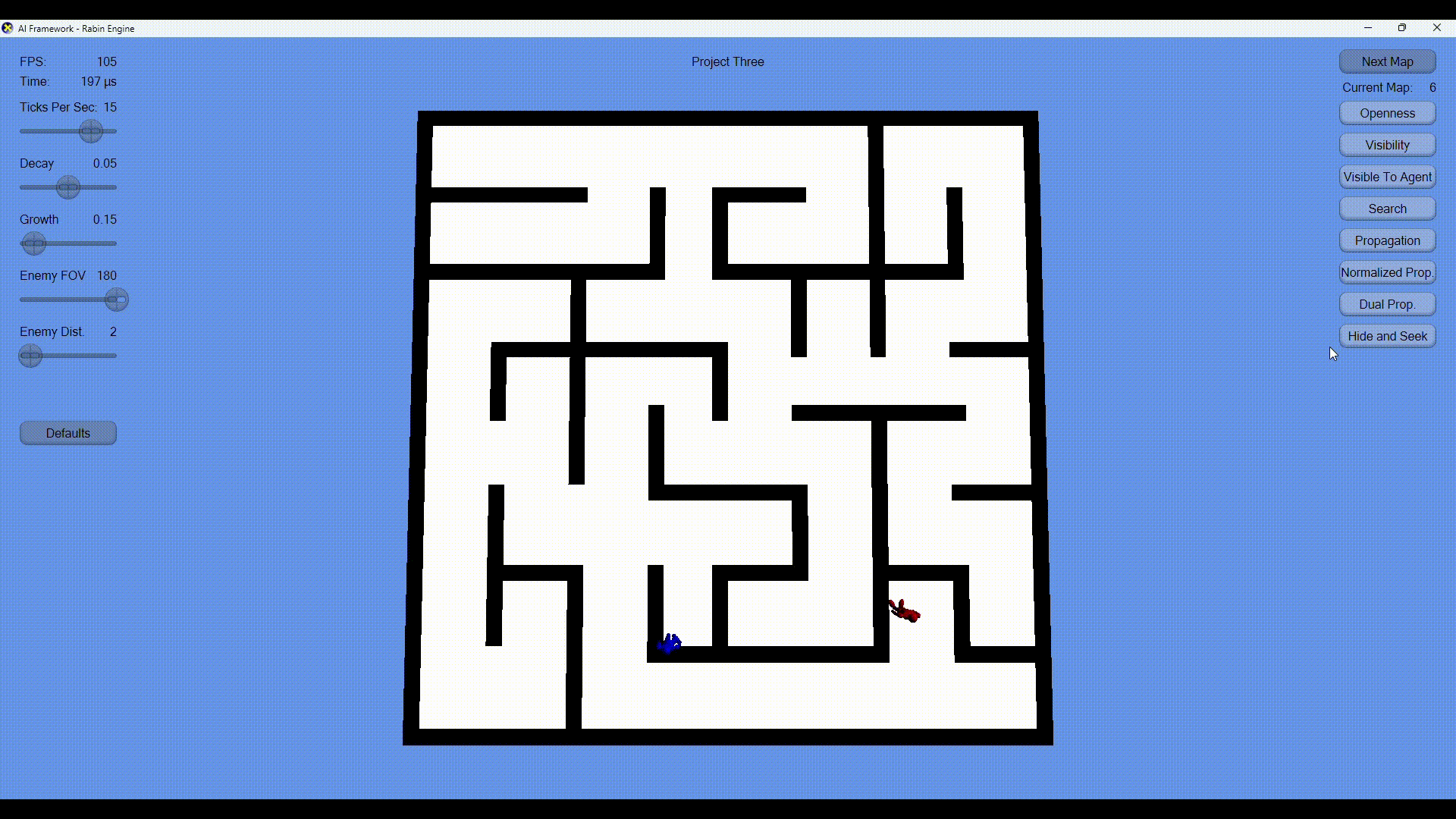 When the NPC doesn't know where the player is, the last known player position starts propegation (red) to guide where to search